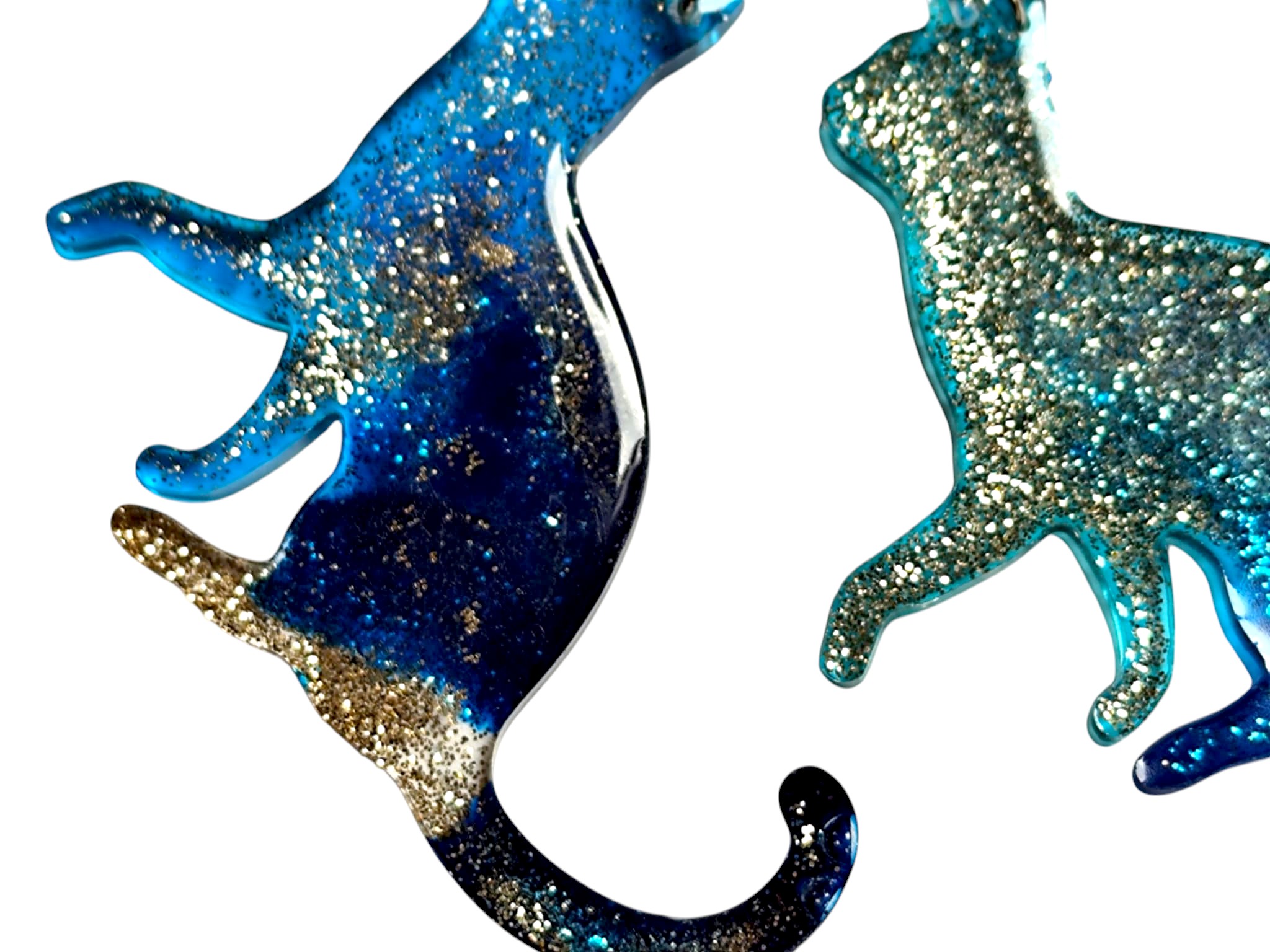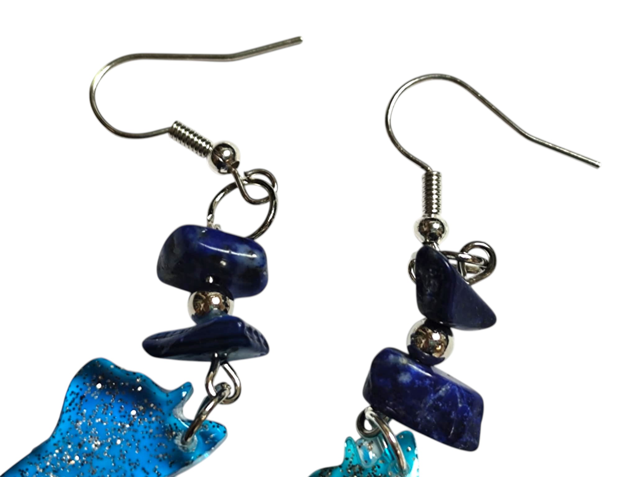 Prezentowana para to słodkie koteczki, z żywicy w różnych odcieniach niebieskiego, z dodatkiem brokatu. Dodatkową ozdobą są naturalne kamienie i srebrny koralik. Zapięcie bigiel otwarty w kolorze srebrnym.