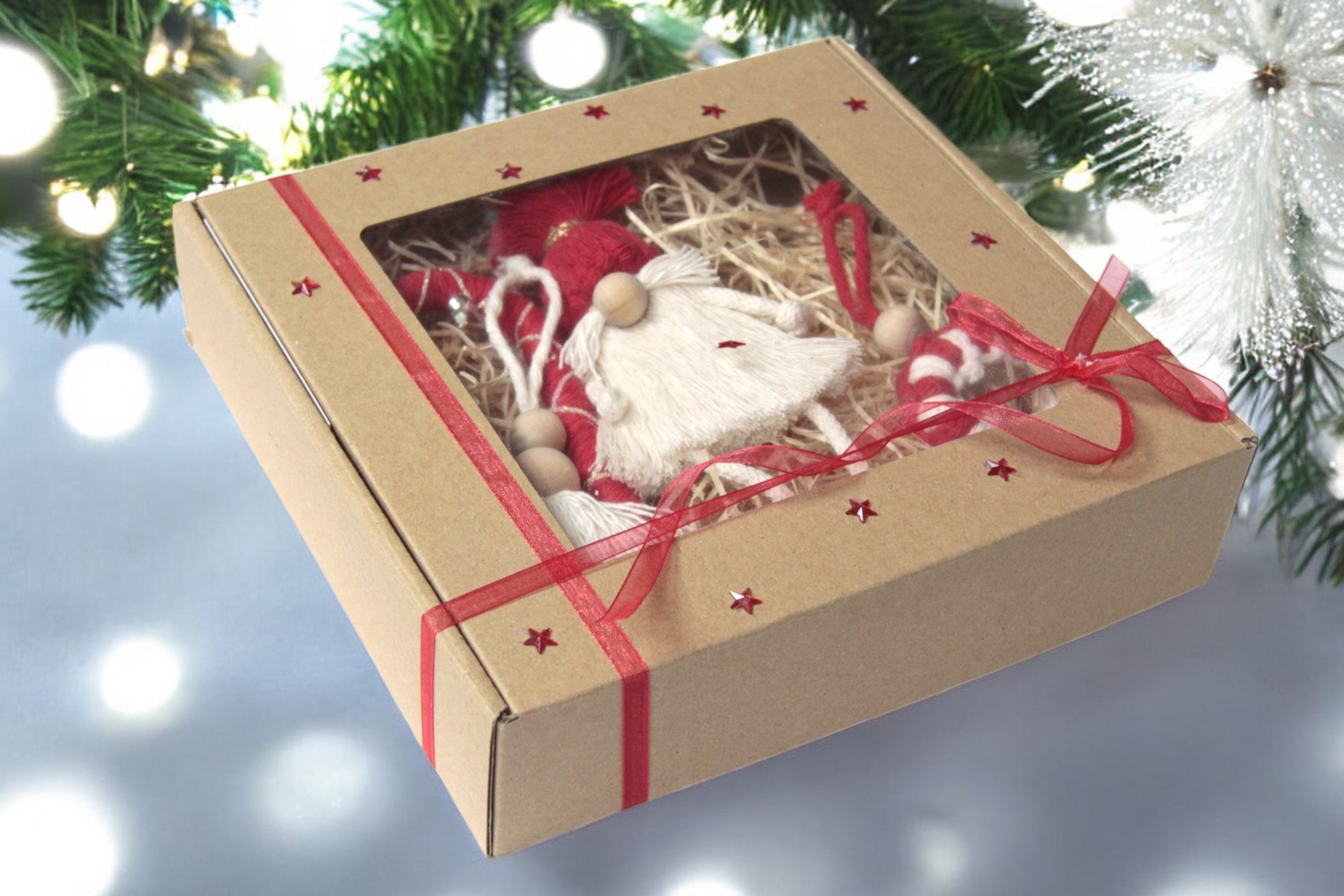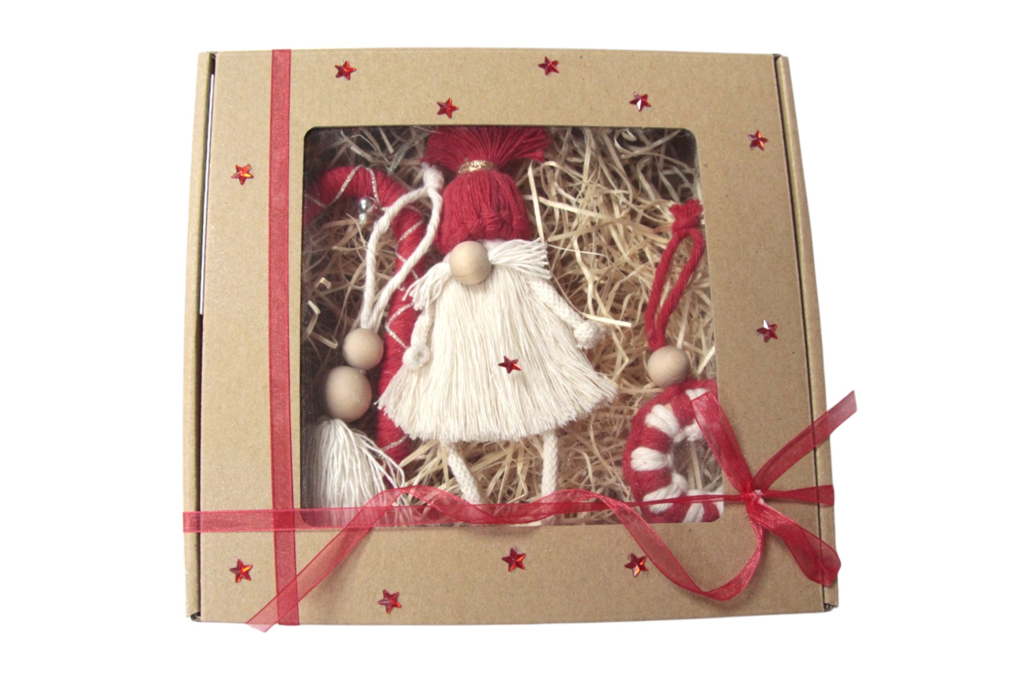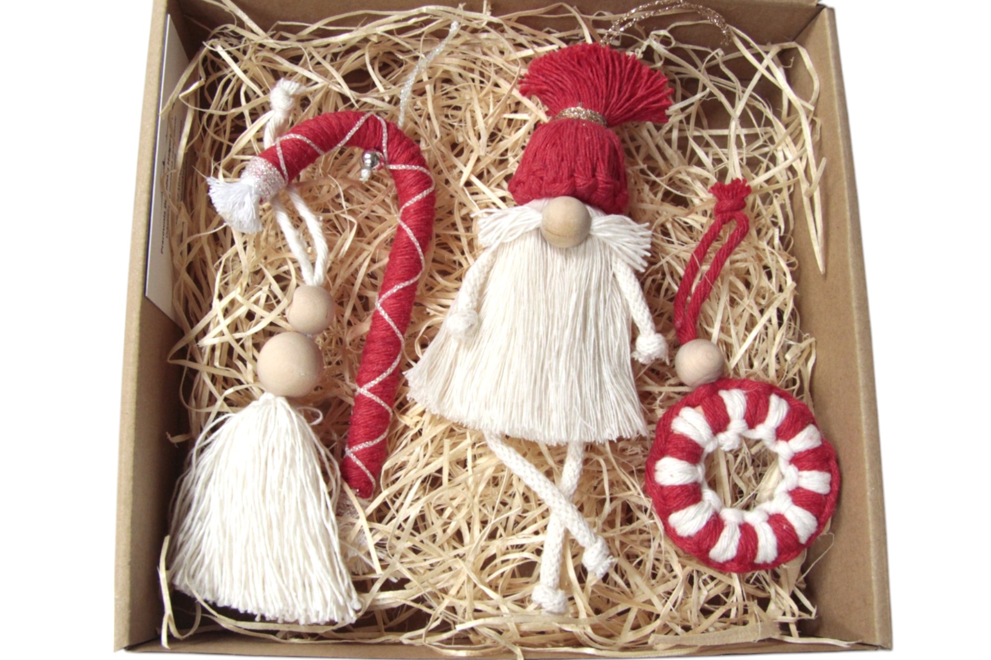 Moja propozycja na wyjątkowy prezent z okazji świąt to pudełko z makramowymi ozdobami choinkowymi. W środku znajduje się skrzat (wysokość około 18 cm bez zawieszki) oraz 3 różnego rodzaju zawieszki – laska, kółeczko, zawieszka z chwostem. Pudełko jest przewiązane dekoracyjnym sznurkiem oraz ozdobione kokardkami, gwiazdkami i gwiazdką z koralików. Czyli nic nie trzeba pakować – kupujesz pudełko i wręczasz jako prezent. Od ręki dostępnych jest kilka zestawów.